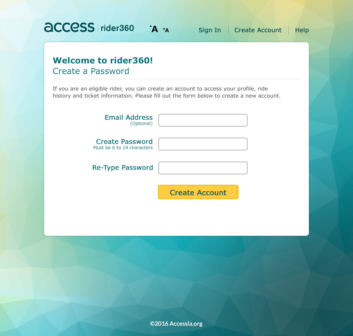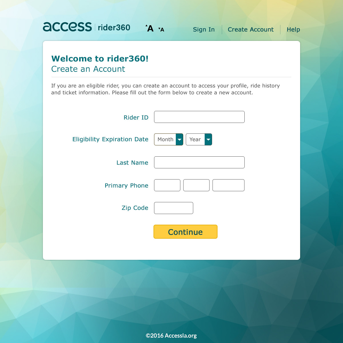 Access Services, the consolidated Transportation Services Agency (CTSA) for Los Angeles County, is responsible for the administration of Access, the Americans with Disabilities Act (ADA) mandated paratransit transportation program for Los Angeles County. They requested a colorful, modern design for their Rider360 portal site that would embrace web accessibility standards (WCAG) while maintaining an upbeat, playful style.